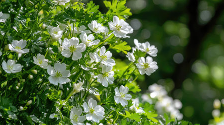 A closeup image of bright white flowers blooming amidst lush green foliage, capturing the beauty of nature. The sunlight creates a serene atmosphere.