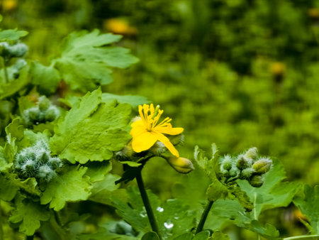 Young green buds and yellow flowers of celandine in spring. The Latin name of the plant is Chelidonium L. The concept of traditional medicine.