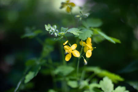 Greater Celandine, yellow wild flowers, close up. Chelidonium majus is poisonous, flowering, medicinal plant macro
