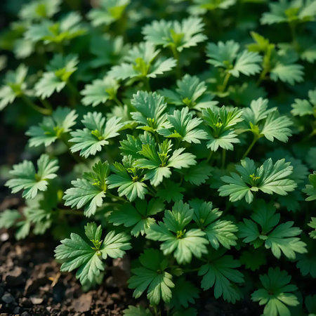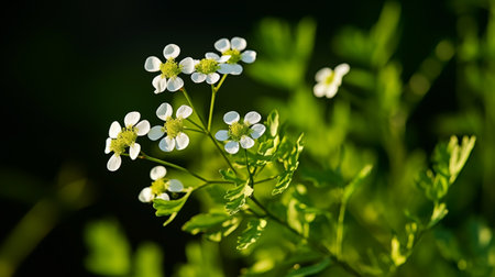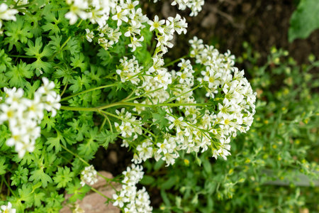 Apium nudiflorum fools water cress edible plant with green leaves and small white flowers on green background light by flash