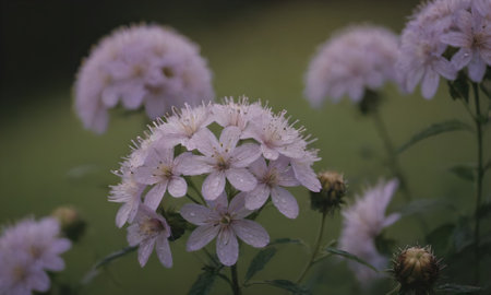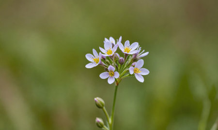 A delicate cluster of white wildflowers blooms against a blurred green background
