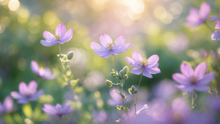 AI Generated. Purple Flowers Bask In Soft Sunlight Garden Bloom
