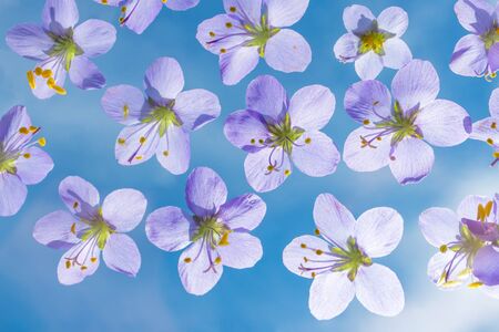 Violet flowers on a background of blue sky. Bright summer cute image for banner, postcard. View from below.