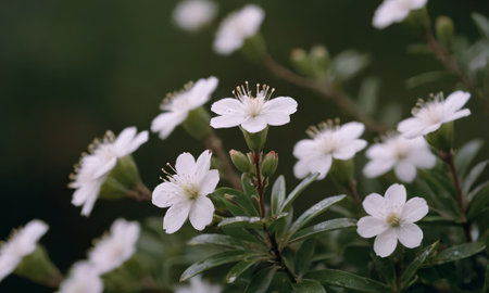 Soft white blossoms gently open amid lush greenery, creating a tranquil scene that exudes purity and peaceful solitude in nature's embrace.