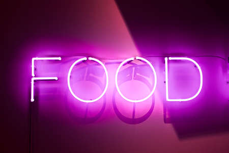Purple neon light creating the word DANCE on a black wall in a disco or night club