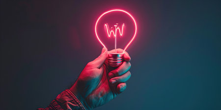 Hand holding a lightbulb with a red neon glow on a blue background