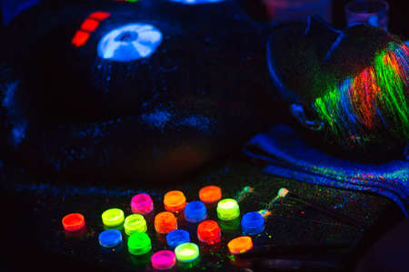 Portrait of man doctor in protective clothes in ultraviolet neon light