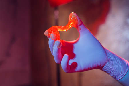 Liquid sugar for skin epilation rubber gloves close-up.