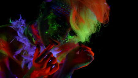 creative makeup and body art by fluorescent paints, female figure in darkness with UV lights