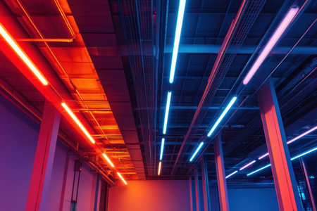 This image features a modern industrial space illuminated by vibrant neon lights, showcasing a dynamic interplay of red and blue hues across the ceiling.