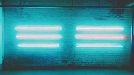 Futuristic neon light patterns on dark brick wall for modern design and ambiance