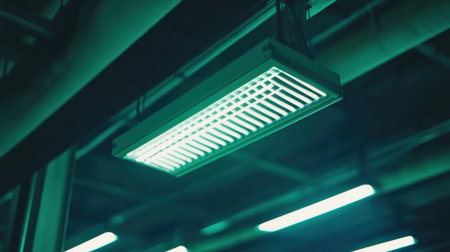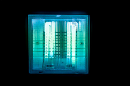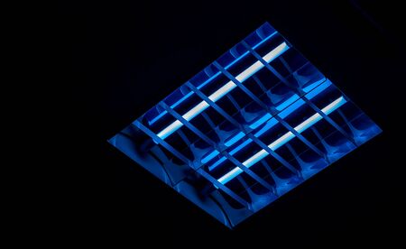 Close-up of a background image under a fluorescent light blue light in a square frame mounted to the ceiling against darkness.
