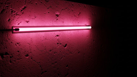 An abstract composition multiple linear neon tube lights in a vibrant magenta hue mounted on a dark, textured wall. The lights are arranged in a dynamic, seemingly random pattern, creating a striking visual effect. Each tube emits a bright, electric glow, casting a soft illumination on the surrounding dark surface. The clean lines and geometric arrangement of the lights contrast with the rough texture of the wall, creating a modern and futuristic aesthetic. evokes a sense of urban nightlife,...