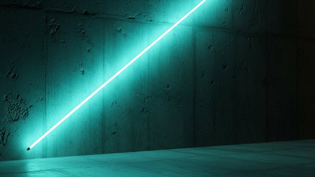 A single, bright turquoise neon light tube is positioned diagonally across a dark, textured concrete wall. The light is intensely vibrant and casts a cool glow on the rough surface of the wall and the floor below. The minimalist composition emphasizes the sharp, clean line of the neon against the industrial backdrop. The contrast between the bright light and the dark surroundings creates a striking and modern visual.