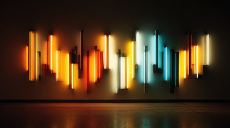 Brightly colored neon tubes create a stunning visual effect in this modern design. The vibrant hues and soft background evoke a dynamic and energetic atmosphere.