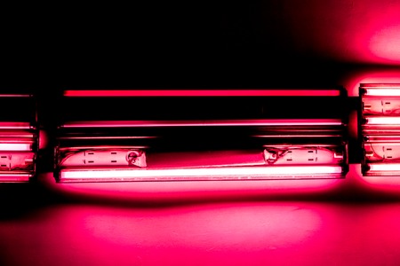 crimson horizontal lamp on black ceiling as illuminated markings automobile highway, long lamp divided into sections with lights and gradient effect against dark office ceiling