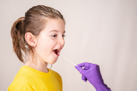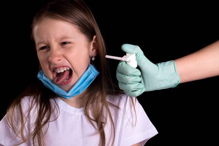 Doctor hands in protection gloves putting coronavirus test swab into kid mouth
