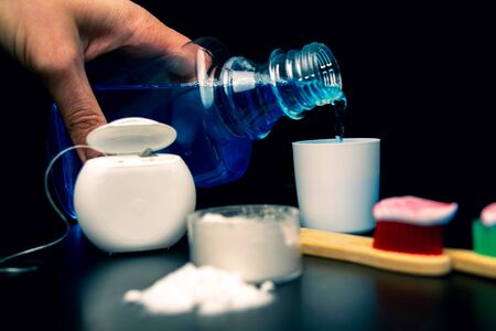Dental and oral care products. Hygiene of teeth and oral cavity. Black background