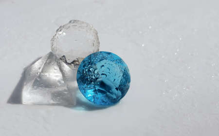 glass figures, ball, stone and pyramid in drops of water, on a white background, macro photo