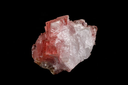Macro pink Smithsonite mineral stone on microcline on black background close up