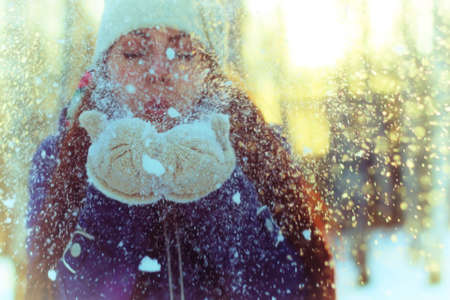 Close portrait of a girl teenager wearing red jacket and hat and blowing the snow out of her hands at the winter park. Young woman having fun on a bright winter day in the forest. Happiness concept.