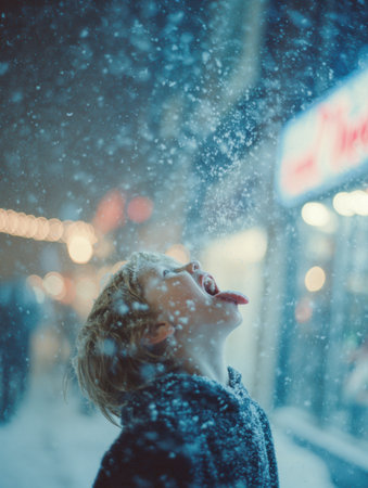 A young child with blonde hair is standing in the snow at night, joyfully catching falling snowflakes on their tongue while surrounded by festive lights.