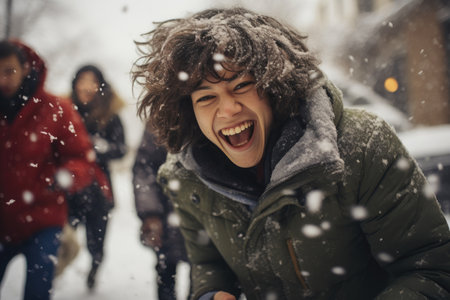 A snowball fight between friends, their faces lit up with laughter as snowflakes fill the air.