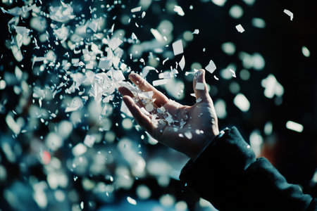 A close-up shot of a persons hand reaching out to touch a cascade of white confetti falling against a dark, blurry background with beautiful bokeh lights.
