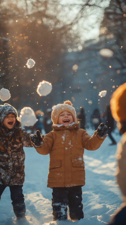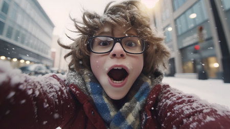 Excited children are joyfully playing in the snow, laughing and having fun. They engage in a friendly snowball fight with friends, taking selfie and creating cherished memories on their winter holiday. Positive and laughing, enjoying a snowy winter day