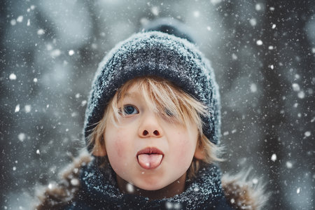 A joyful blond boy catches falling snowflakes with his tongue, surrounded by a snowy forest.