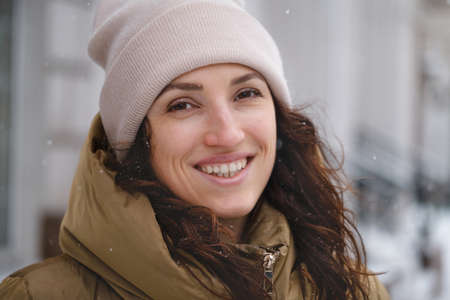 Portrait of middle aged blissful woman looking at camera smiling with teeth wearing warm winter clothes with hat and hair covered with snow. Lovely winter time full of white colors