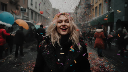 Young blonde girl with colorful confetti on the streets of the city