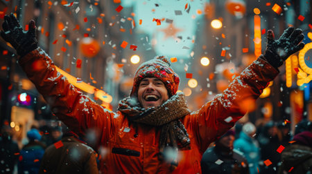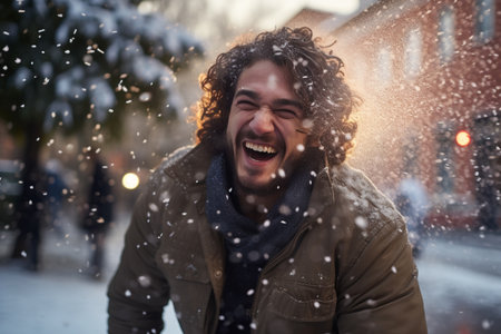 A man stands outdoors, smiling joyfully as snowflakes swirl around him in a winter landscape. His warm hat protects him from the cold while he embraces the beauty of snowfall.