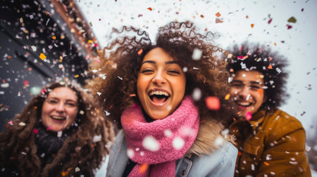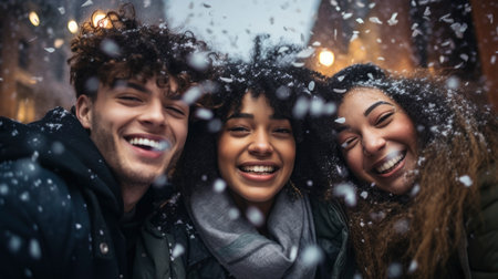 Multiracial group of young happy friends meeting outdoors in winter