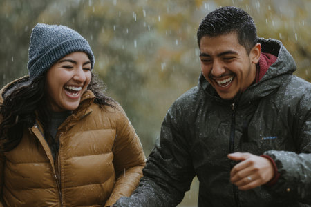 A young Hispanic couple laughing as they get caught in the rain, running hand in hand shelter.