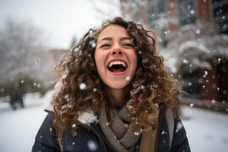 Close up portrait of a happy young woman having fun outdoors in winter
