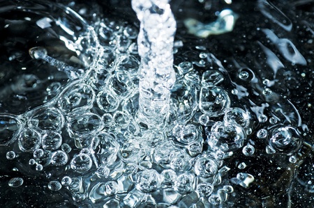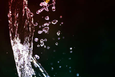 Drops of water close-up macro with a sunlight fall on the heavy splash water surface on a blue background
