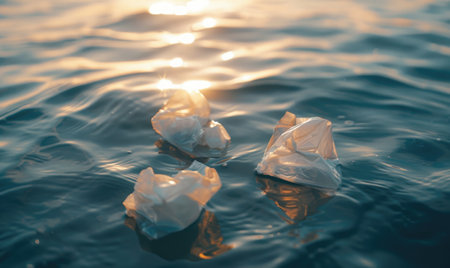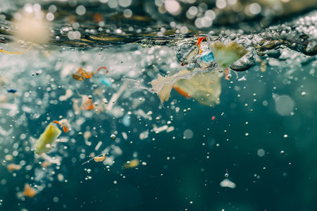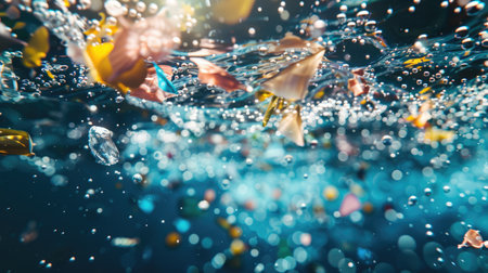 Background with microplastic particles floating in ocean or sea water. Environmental plastic pollution problem of rubbish and trash