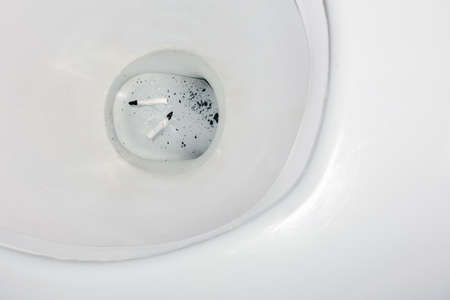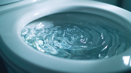 A close-up of a ceramic toilet bowl flushing, with water swirling in the bowl, emphasizing the cleanliness and efficiency of the system.