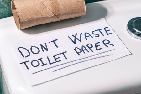 Don't waste the toilet paper. Message written on a paper with a finished roll of toilet paper due to coronavirus.