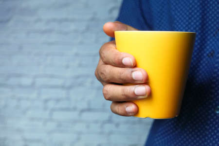 Romanian Lei currency banknotes held by male hand. Close up studio shot, isolated on blue background.