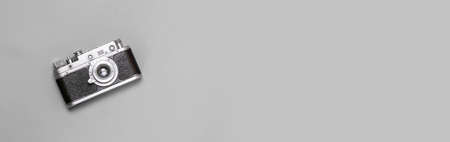 Old rangefinder camera on grey background. Top view. Place for text. Copyspace