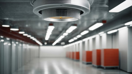 Focused environmental sensor mounted near an exhibit with soft bokeh effect on surrounding gallery space illustrating discreet realtime monitoring of temperature and humidity.