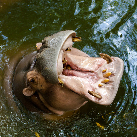 Hippopotamus is opening its mounth for food feeding.
