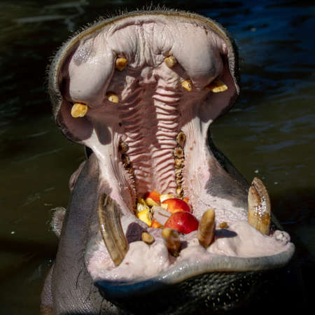 Hippo facial expressions during feeding time. Busch Gardens Wildlife Park, Tampa, Bay, Florida