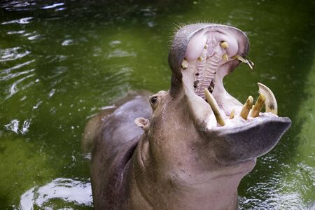 Hippopotamus open huge mouth in water
