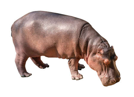 Isolated Hippopotamus on white background, side view Hippopotamus, Hippopotamus head down on the ground.