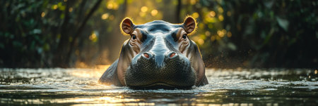 A peaceful hippopotamus basks in calm waters, surrounded by lush greenery and dappled sunlight. This serene wildlife scene captures the essence of nature's beauty.
