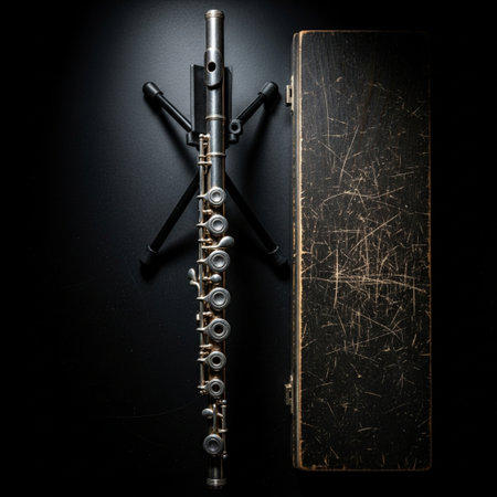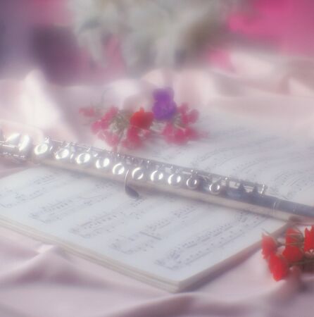A beautiful close-up image featuring a flute elegantly placed on open sheet music, surrounded by soft warm lights creating a serene and inspiring musical ambiance.