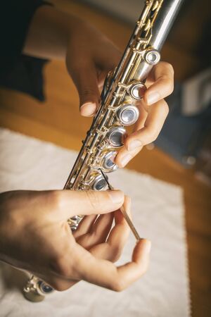 Detail of female fingers on flute keys with copy space and soft pastel background